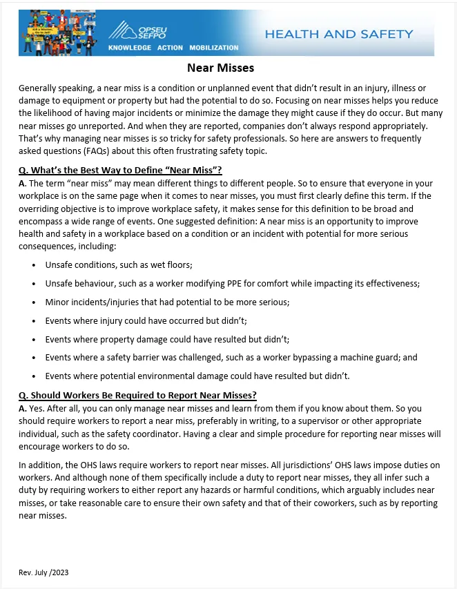 This document explains what near misses are and why reporting them is critical to preventing workplace injuries and incidents.