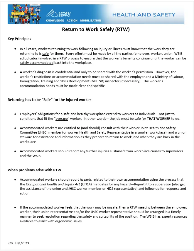 This guide outlines best practices and legal requirements for ensuring workers return to work safely after injury or illness. It emphasizes the importance of accommodation, safe job assignments, and maintaining worker benefits until safe return is possible.