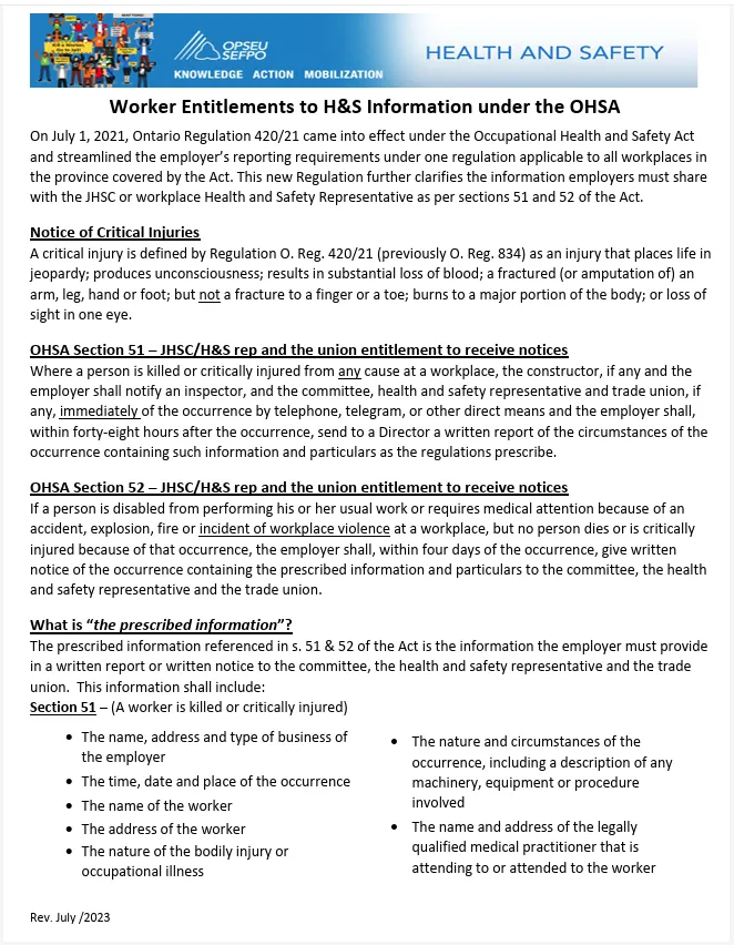 These rights are under Ontario’s Occupational Health and Safety Act. It outlines employer reporting duties for critical injuries, fatalities, work-related illnesses, and other incidents. It also lists required timelines and details that must be shared.
