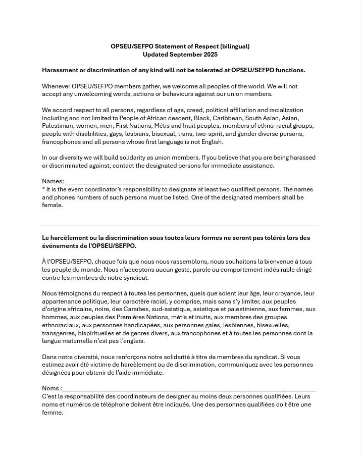 OPSEU/SEFPO's golden rule - Whenever OPSEU/SEFPO members gather, we welcome all peoples of the world. We will not accept any unwelcoming words, actions or behaviours against our union members.