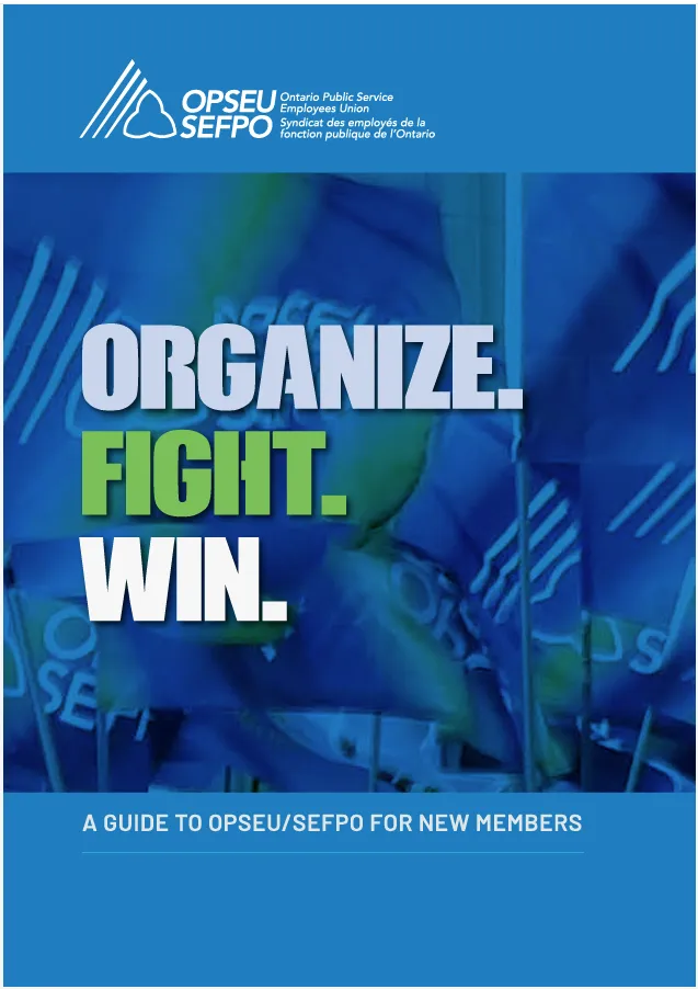 This Owners’ Manual will help you find your way around your union, understand how it works, and what your place is in it. We want you to be able to get involved in OPSEU/SEFPO, doing things that reflect your interests and priorities. We may be a large organization, but it’s the experience and imagination of individuals that produce the best results for everyone we represent.