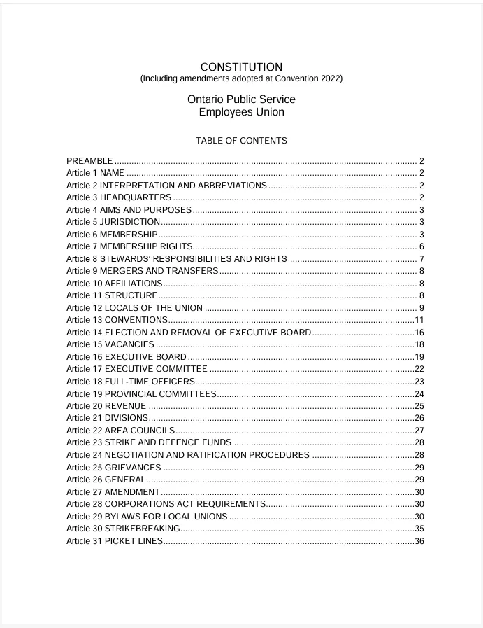 The Ontario Public Service Employees Union/Syndicat des employés de la fonction publique de l’Ontario (OPSEU/SEFPO) was founded in 1911 under the name “Civil Service Association of Ontario.” The Association was incorporated under the Corporations Act of Ontario in 1927. The Members and Officers adopted the present name of the Union in 1975, in accordance with, and to be governed by, the provisions that are contained in this Constitution.