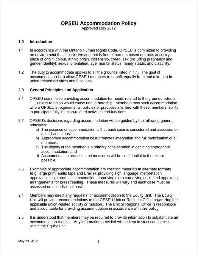 The goal of accommodation is to allow OPSEU/SEFPO members to benefit equally from and take part in union-related activities and functions.